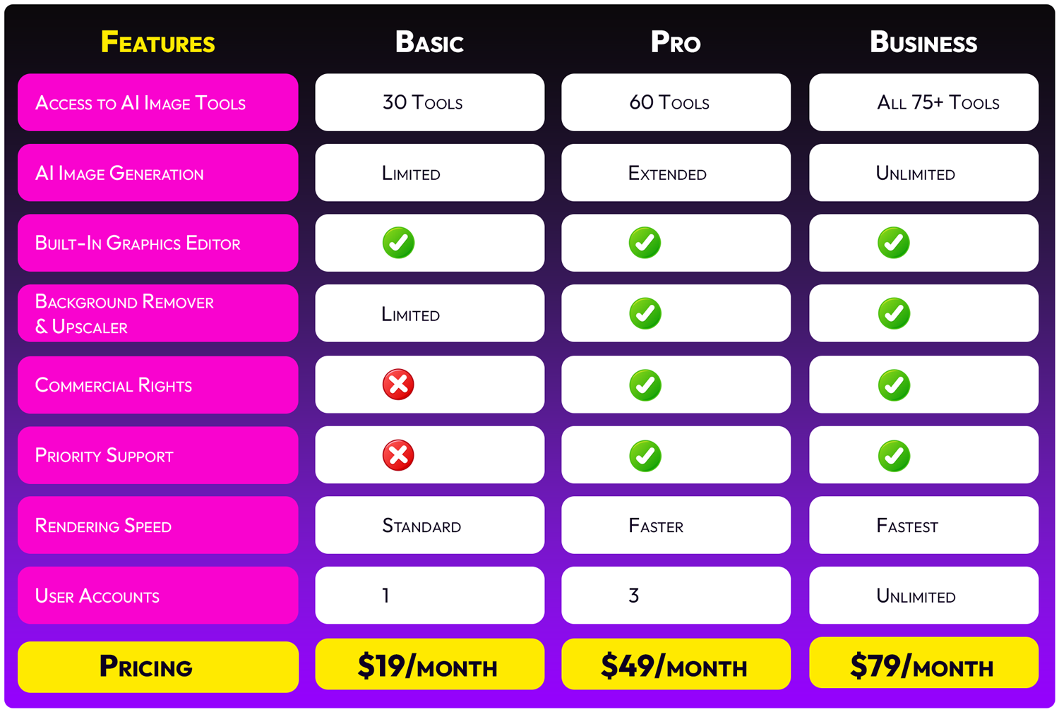 The Business Plan gives you unlimited usage and rendering rights. Basic and Pro plans have fair usage limits, but you can upgrade anytime for unlimited access.